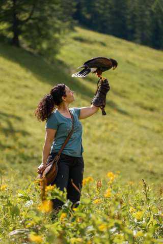 Provate il fascino della falconeria da vicino! Presso la falconeria Galina di Malbun, potrete fare un tour con un falco Harris e diventare voi stessi falconieri.