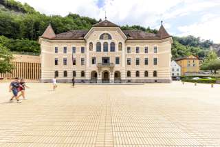 Edificio governativo di Vaduz con facciata chiara e piazza antistante.