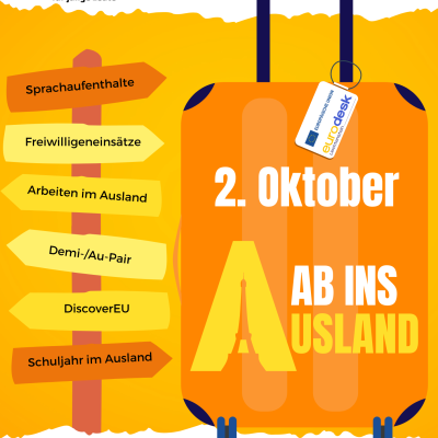 L'evento informativo gratuito "Ab ins Ausland" si terrà giovedì 2 ottobre 2025 tra le 18.00 e le 20.00 presso l'aha di Vaduz. In questa serata potrete informarvi su diverse opportunità all'estero. Samantha e Tanja di aha, così come fornitori esterni e giovani giramondo, risponderanno alle vostre domande e condivideranno le loro esperienze su soggiorni linguistici, progetti di volontariato, work & travel o lavoro all'estero.