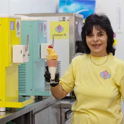 Le deliziose specialità di gelato del bar sono disponibili sia preparate al momento nel giardino dei gelati che congelate in qualsiasi momento nel negozio self-service.