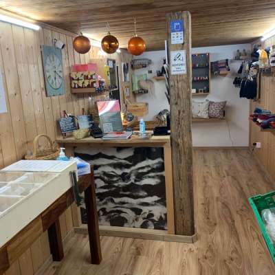 Un'ampia selezione di prodotti di lana, cibi regionali, verdure regionali, prodotti caseari come latte crudo, formaggio, yogurt e uova, prodotti di carne e un mix di fonduta di formaggio.