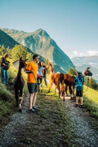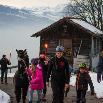 Anna-Lena e Marc, della fattoria dei lama e degli alpaca, condividono le loro conoscenze su questi animali affettuosi e garantiscono un'escursione divertente ed educativa. Durante le escursioni più lunghe, i lama trasportano anche le provviste nelle loro gerle.